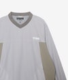 Vネックの抜け感がスポーティーかつクリーンな印象を演出。裏地には通気性に優れたメッシュ素材を使用し、ムレを防いでドライな着心地をキープ。袖口と裾はスピンドル仕様のダブル仕立てで、冷気の侵入を防ぎながらフィット感を調整可能です。