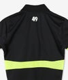 異素材感のある胸の切り替えは抜群の伸縮性。体に吸い付くようにフィットし、それでいてプレーを妨げない本格仕様。