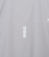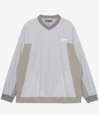 Vネックの抜け感がスポーティーかつクリーンな印象を演出。裏地には通気性に優れたメッシュ素材を使用し、ムレを防いでドライな着心地をキープ。袖口と裾はスピンドル仕様のダブル仕立てで、冷気の侵入を防ぎながらフィット感を調整可能です。