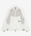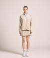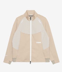 前後身頃や袖下の切り替えには、ドライタッチのストレッチ素材を上から重ねることで耐久性を高めながら、素材の質感コントラストによって上品なスポーティーさを演出。袖口と裾はリブ仕様で風の侵入を防ぎ、アクティブな動きにも対応します。